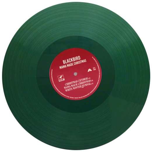 Mama Made Christmas van Blackbird, uitgebracht op groen vinyl. Het ontwerp combineert nostalgische familiefotografie met een warme, retro kerstesthetiek.